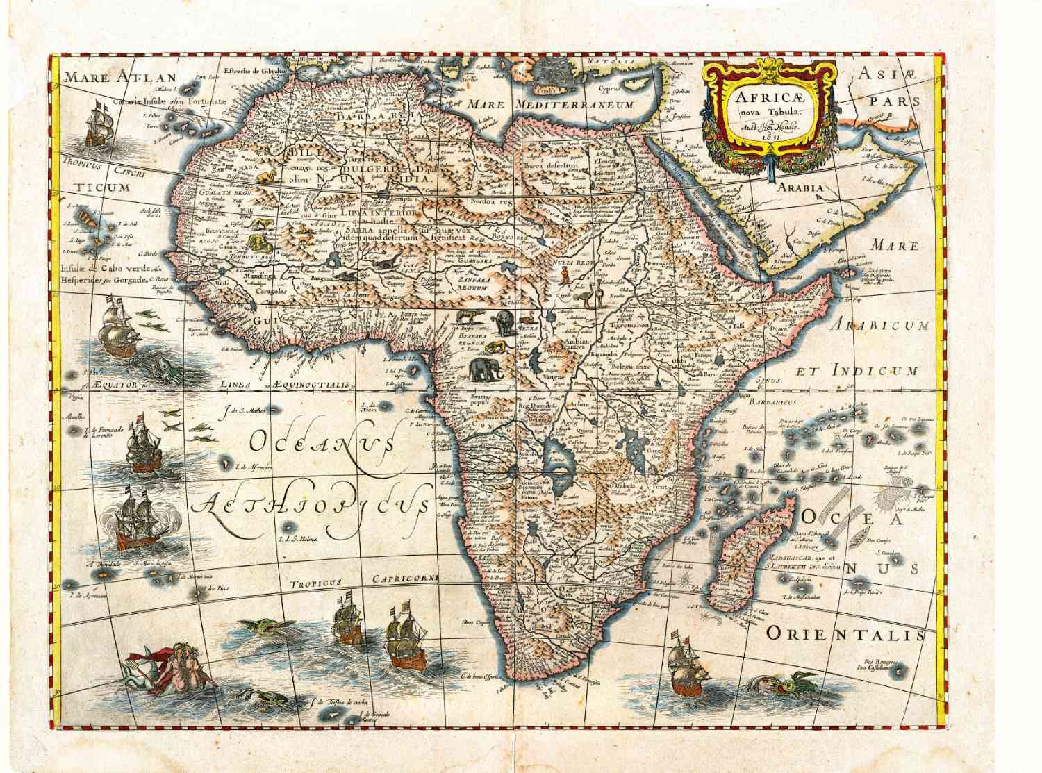 Fraai gedecoreerde en gedetailleerde kaart van Afrika, in 1631 uitgegeven door Hendrik Hondius.