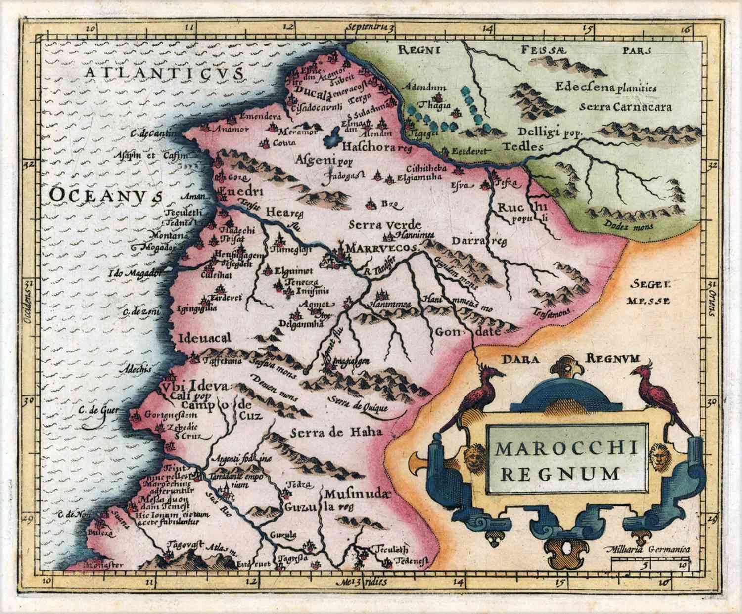 Kaart van een deel van Marokko, aan de Atlantische Oceaan. Gemaakt door Mercator. In 1630 uitgegeven.