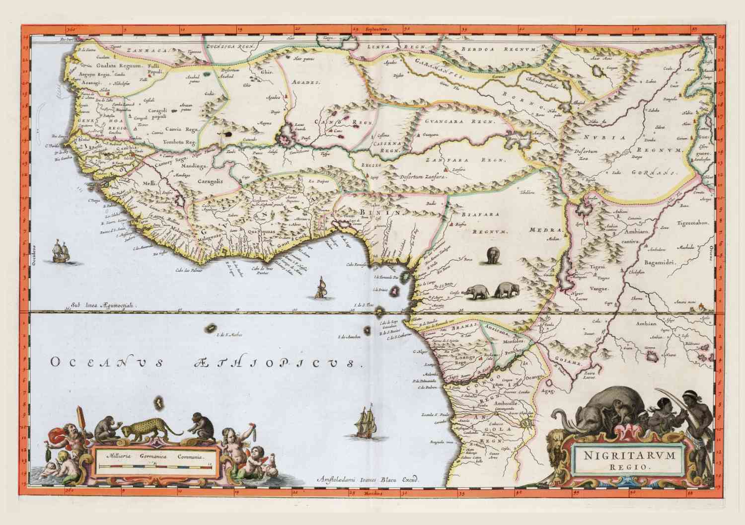 Kaart van West en Midden Afrika, van Senegal in het noorden tot Angola in het zuiden. In 1665 uitgegeven door Joan Blaeu.
