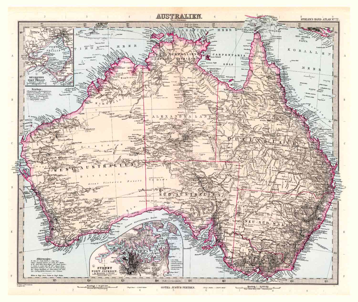 Kaart van Australië afkomstig uit Stieler’s Handatlas uit 1891.