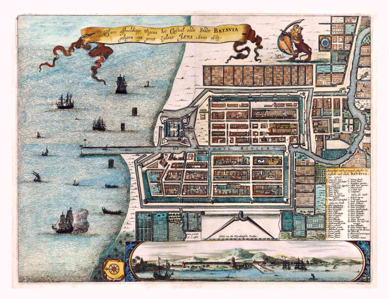 Stadsplattegrond van het oude Batavia, het huidige Jakarta op het eiland Java. In 1669 uitgegeven door Arnoldus Montanus.