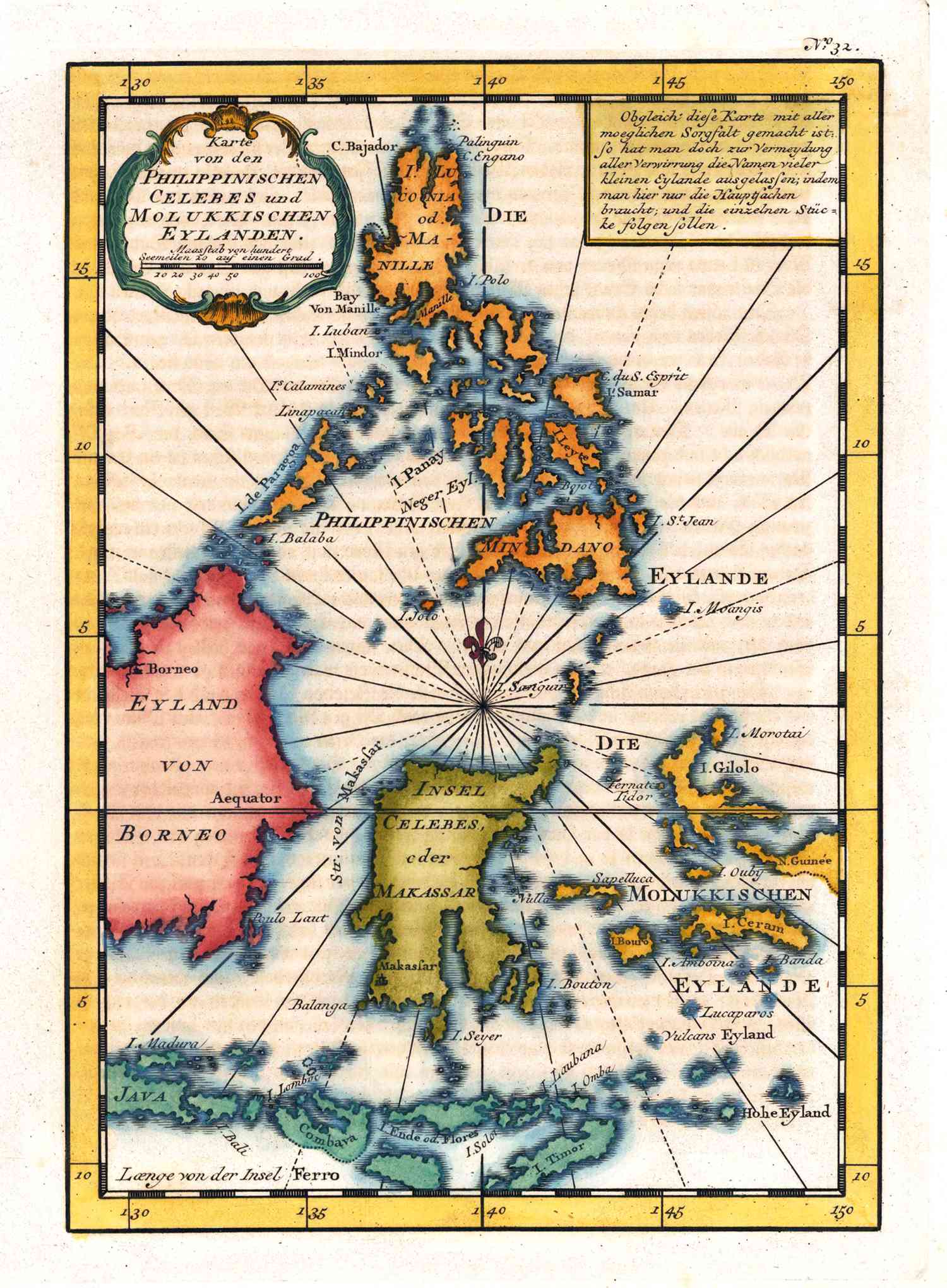 Kaartje van de Indonesische eilanden Borneo, Celebes, Java, Molukken en de Filippijnen, in 1747 uitgegeven door Bellin.