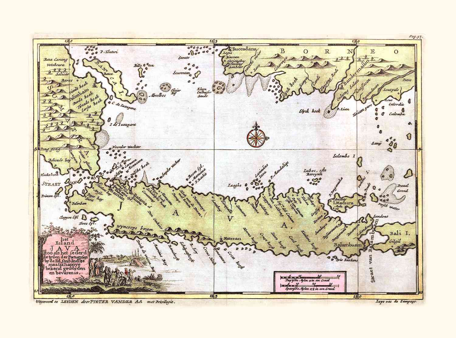 Kaart van het Indonesische eiland Java, in 1706 uitgegeven door Pieter van der Aa.