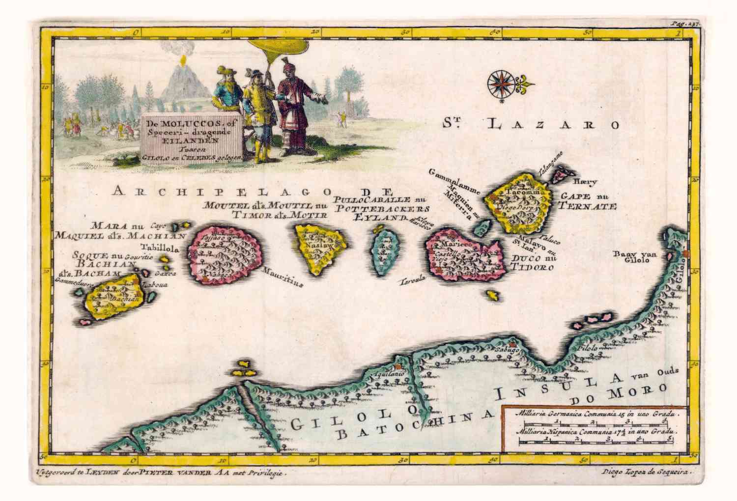 Kaart van de Molukse eilanden Bachian, Machian, Timor, Pottebackerseiland, Tidoro en Ternate. In 1707 uitgegeven door Pieter van der Aa.