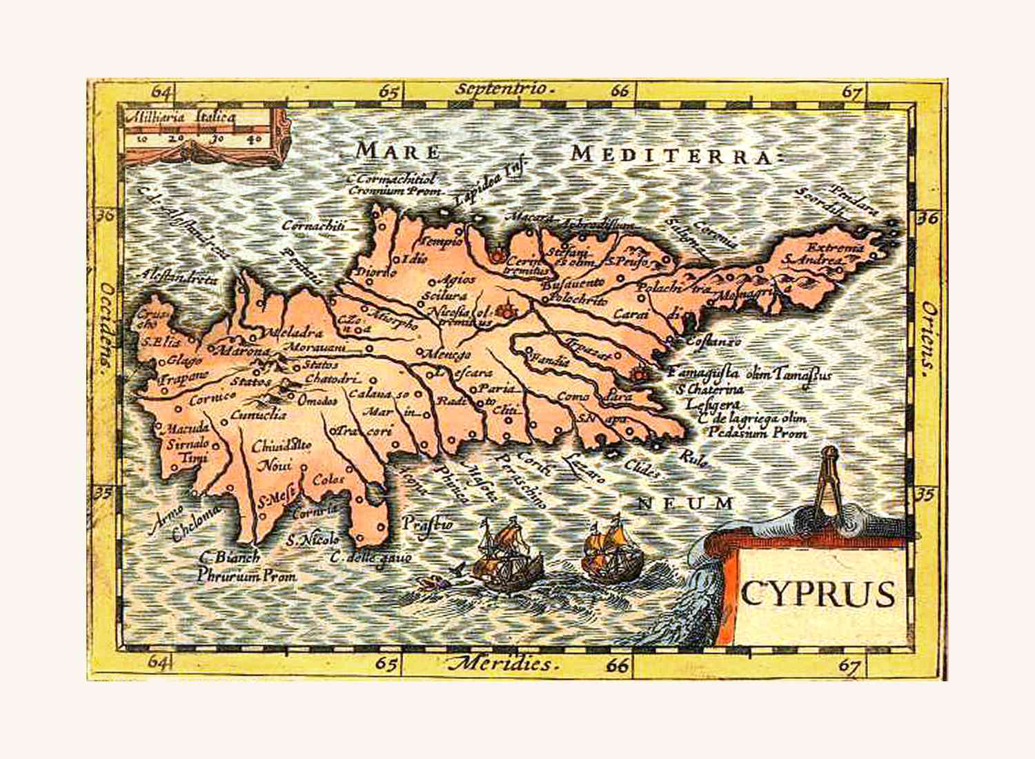 Klein kaartje van Cyprus, in 1616 uitgegeven door Bertius.