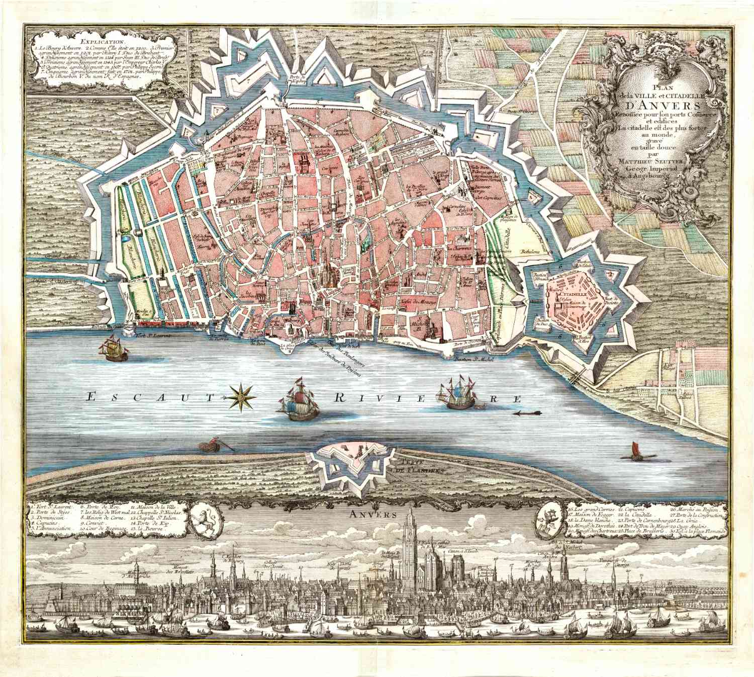 Stadsplattegrond van Antwerpen in 1740 uitgegeven door Mathias Seutter.