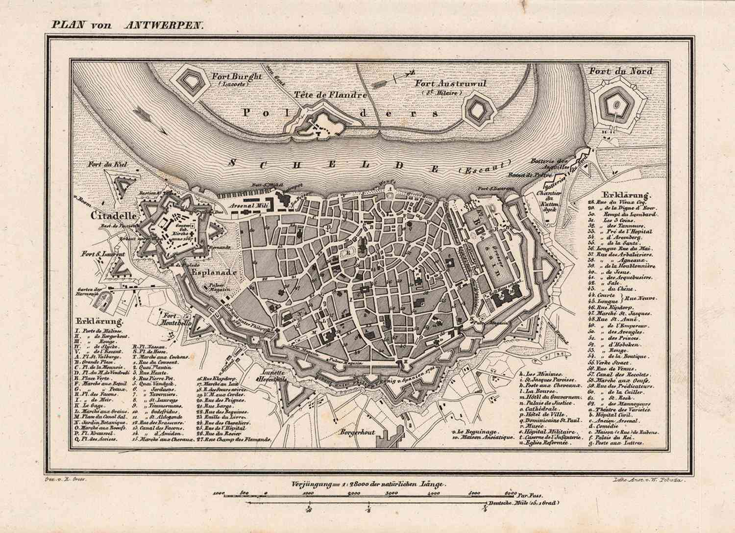 Zwartwit stadsplattegrondje van Antwerpen, in 1844 uitgegeven door. R.Gross.