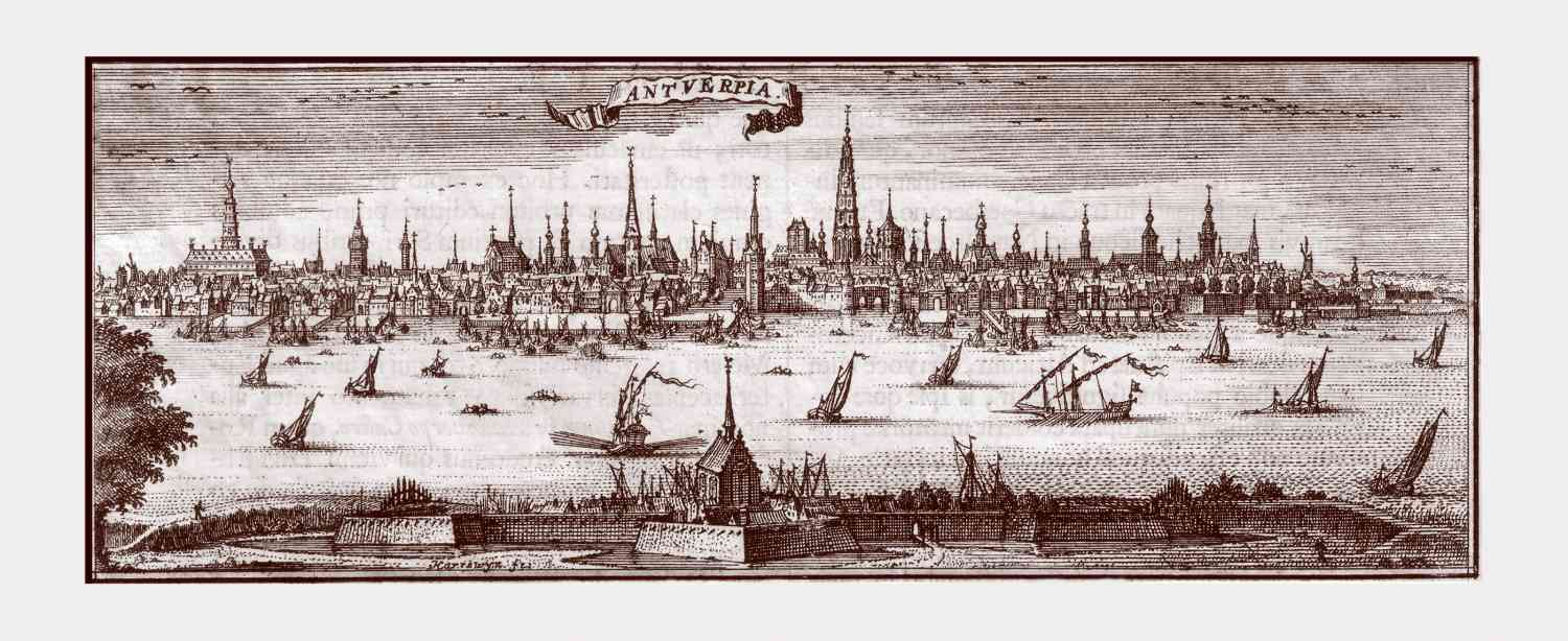 Gravure van gezicht op Antwerpen vanaf de Schelde, in 1708 uitgegeven door Harrewijn.