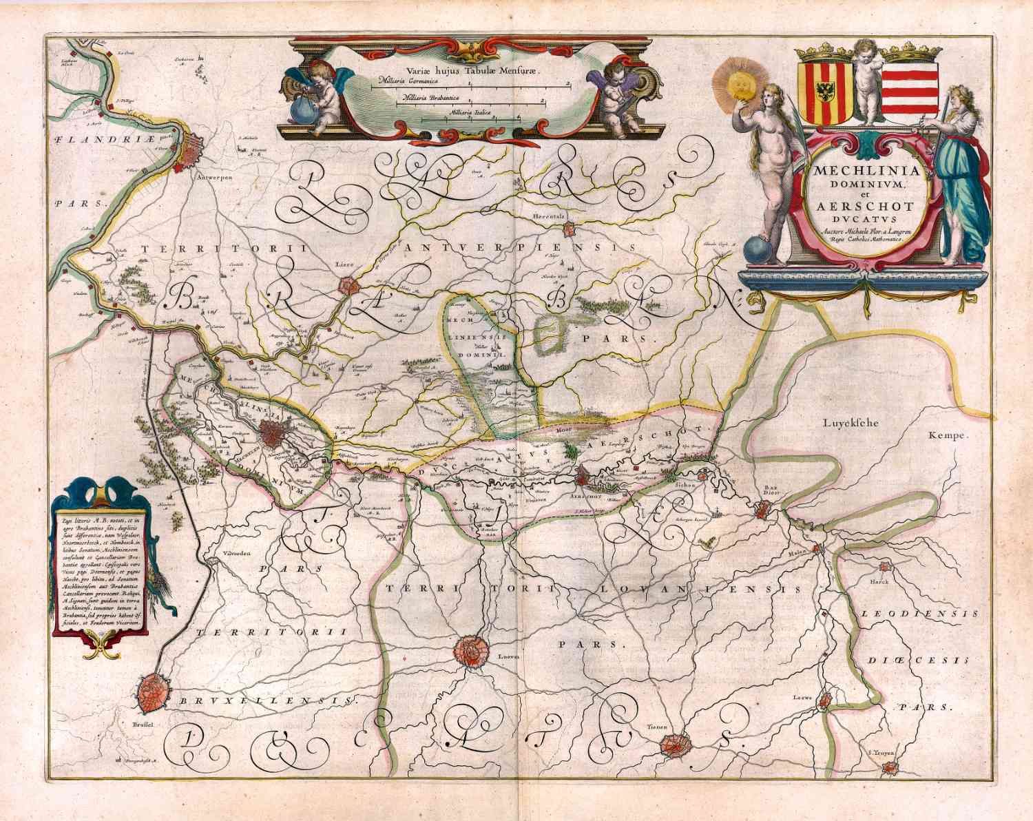 Kaart van de wijde omgeving van de Belgische stad Mechelen en het graafschap Aerschot. Met linksonder Brussel, linksboven Antwerpen. In 1645 uitgegeven door Willem Blaeu.