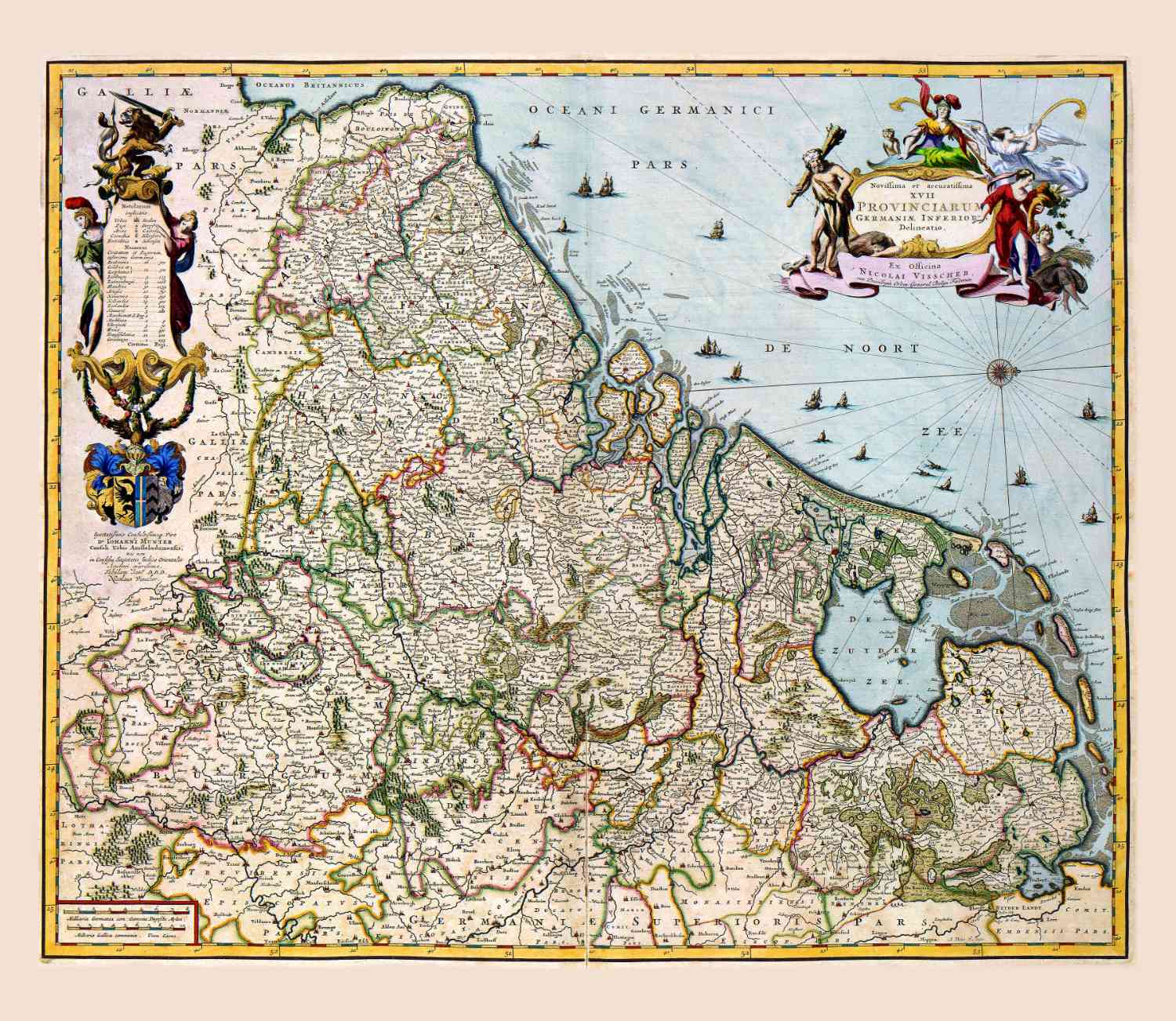 Kaart van de Nederlanden, inclusief België en Luxemburg van Nicolaas Visscher. Het noorden is rechts op de kaart.