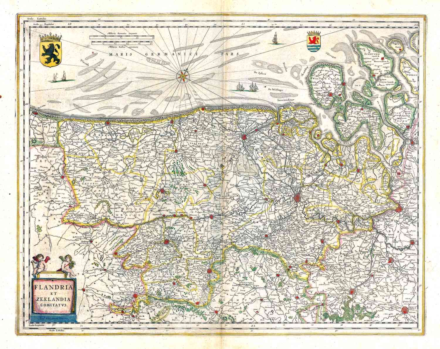 Kaart van Vlaanderen en een deel van Zeeland in 1645 gepubliceerd door Willem Blaeu.