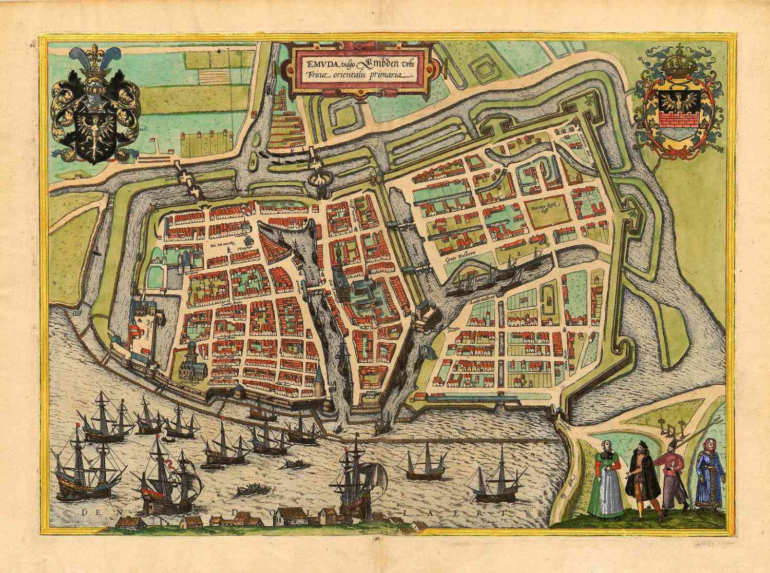 Stadsplattegrond van Emden, in 1575 uitgegeven door Braun en Hogenberg.
