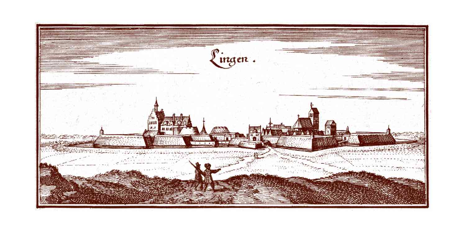 Kopergravure met gezicht op Lingen uit 1650, vervaardigd door Merian.