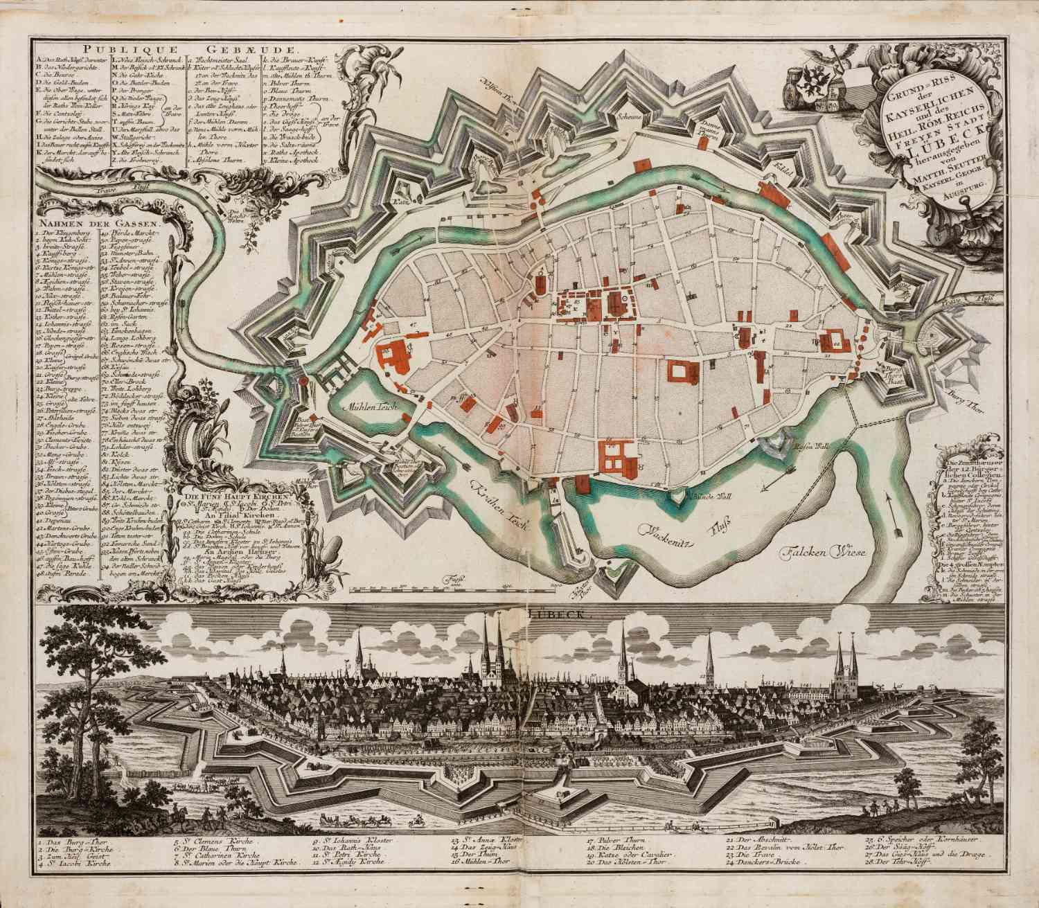 Stadsplattegrond en aanzicht van Lübeck, in 1740 uitgegeven door Seutter.