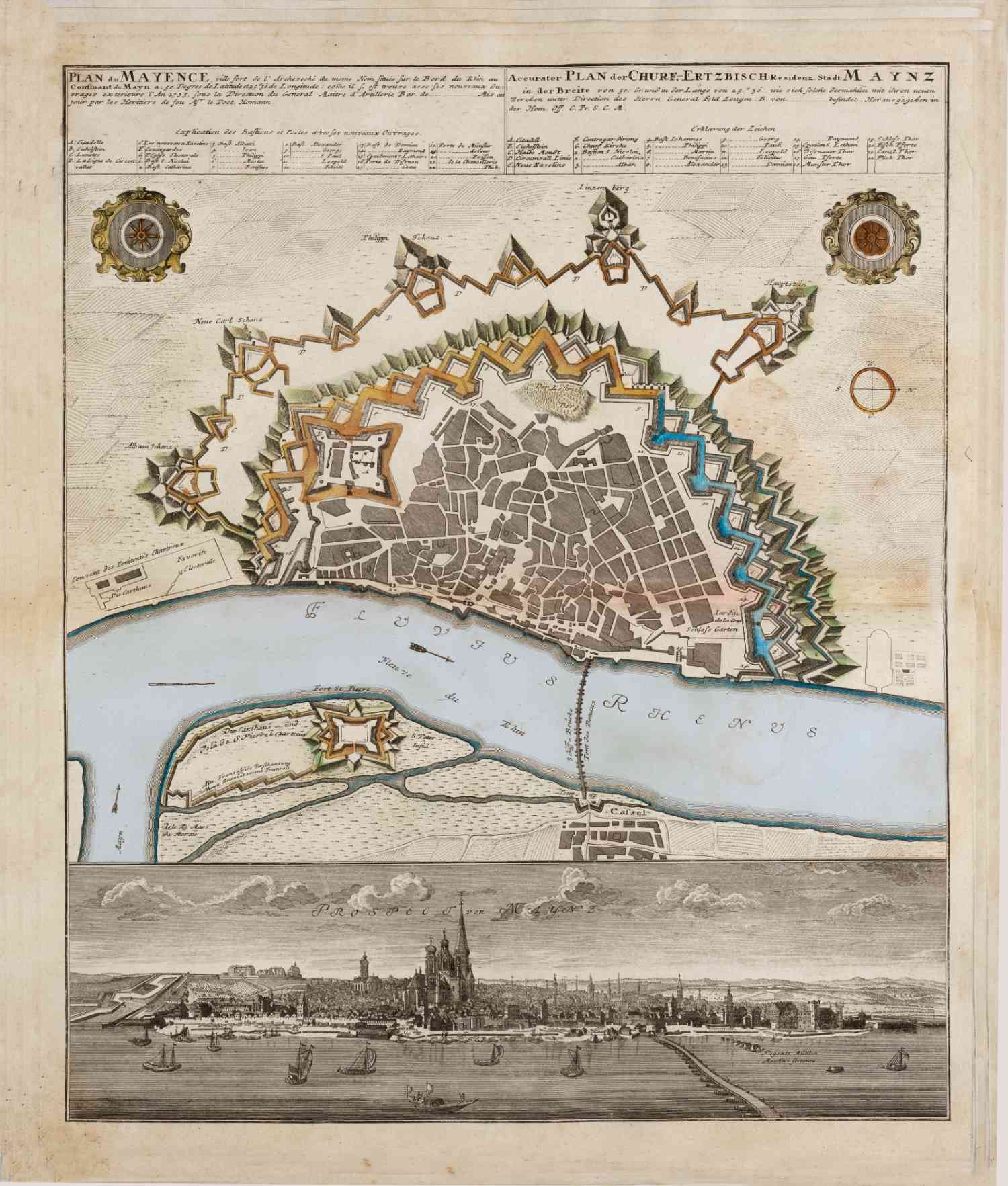Kaart en aanzicht van de stad Mainz aan de Rijn, in 1740 uitgegeven door Homann.