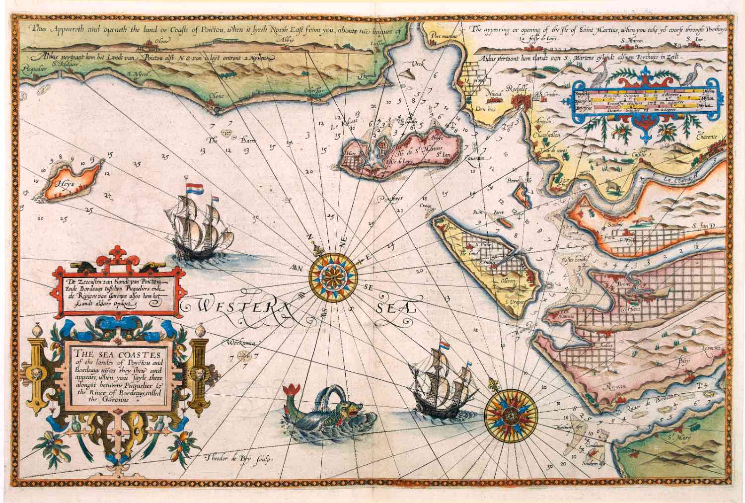 Kaart van een deel van de Franse kust met het eiland d’Oleron, Golf van Biskaje, net boven Bordeaux. In 1605 uitgegeven door Lucas Janszoon Waghenaer.