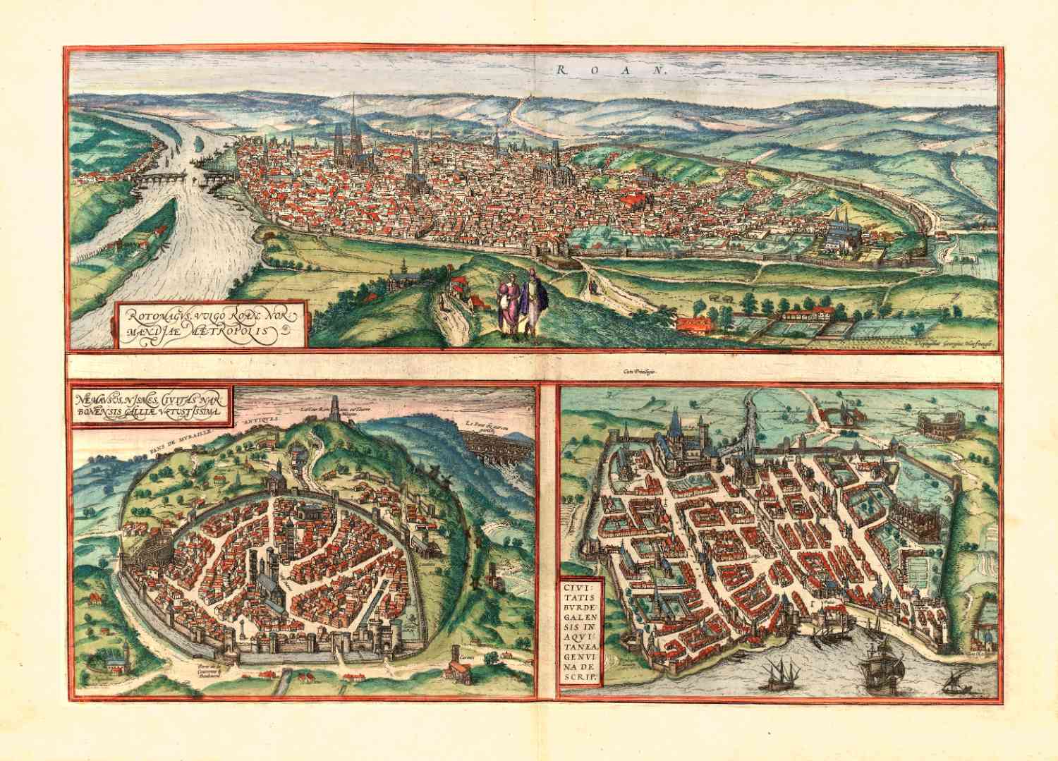 Birdseye-view van de Franse steden Rouan, Nimes en Bordeaux, in 1572 uitgegeven door Braun en Hogenberg.