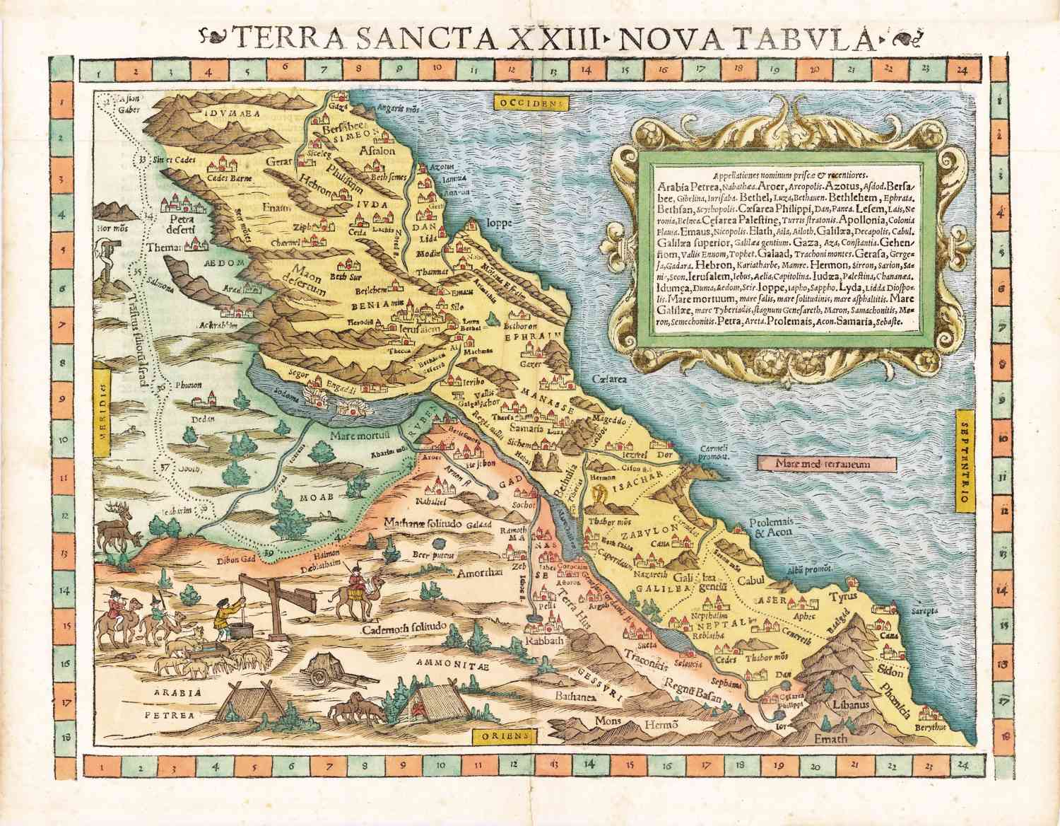 Zeer oude kaart van het Heilig Land, huidige Israel, in 1552 uitgegeven door Sebastian Munster. Het noorden ligt rechts onder in de hoek.