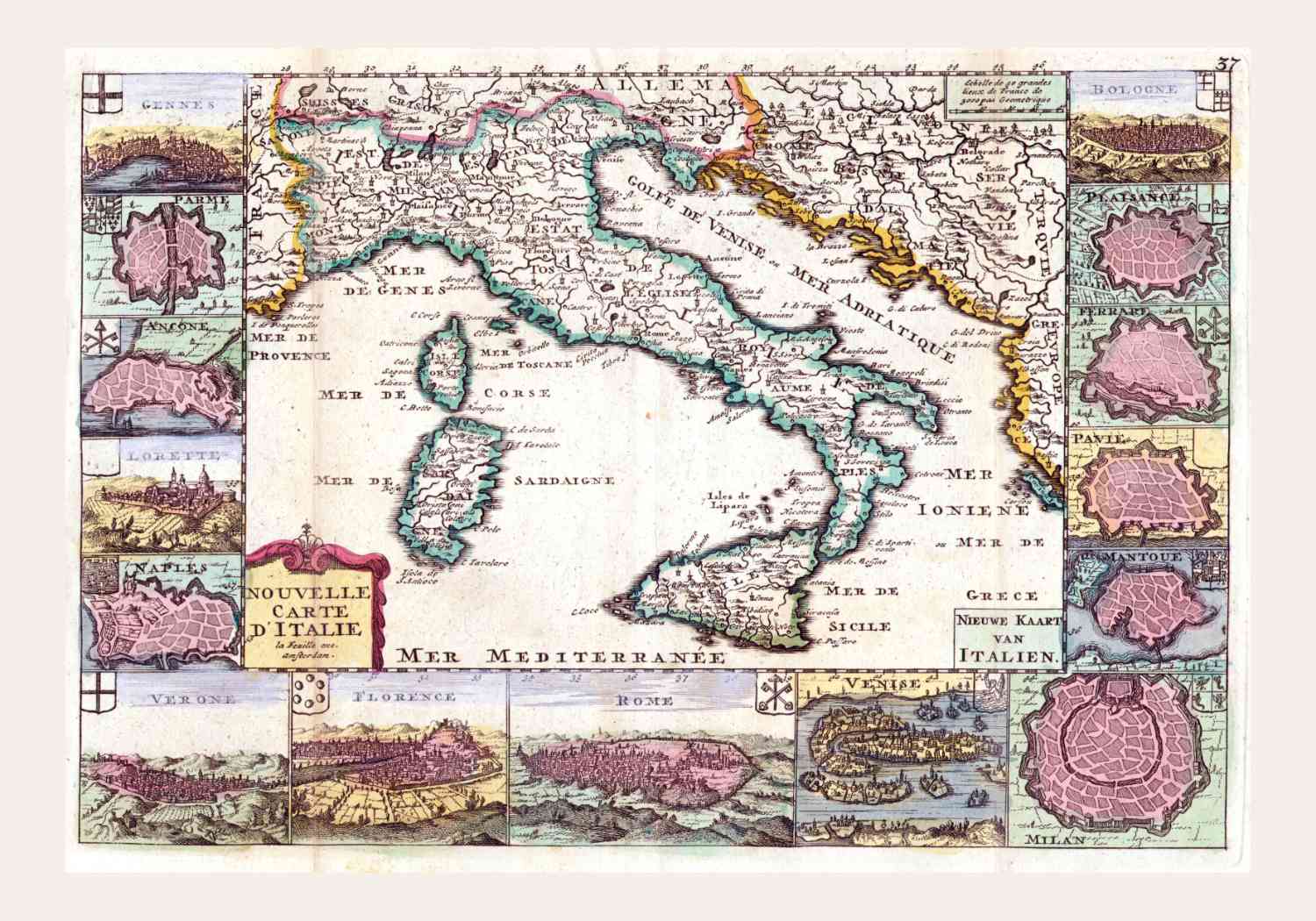 Kaart van Italië met stadsplattegrondjes van belangrijkste Italiaanse steden