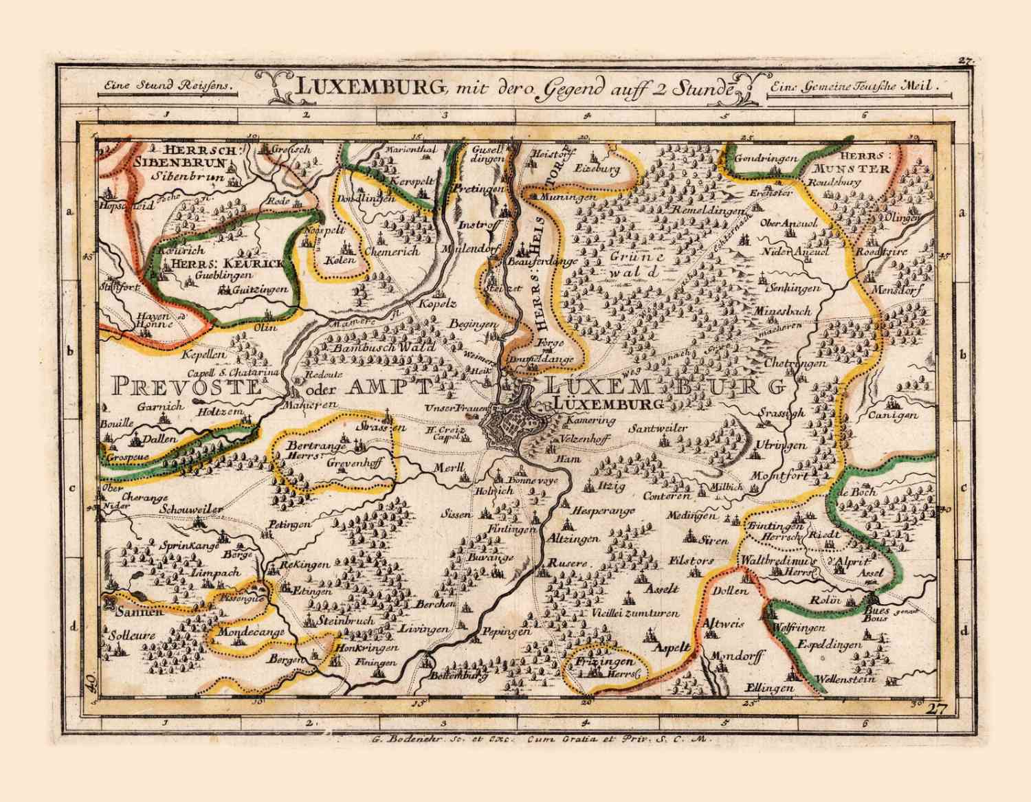 Kaartje van de Stad Luxemburg en omgeving in 1716 uitgegeven door G.Bodenehr.