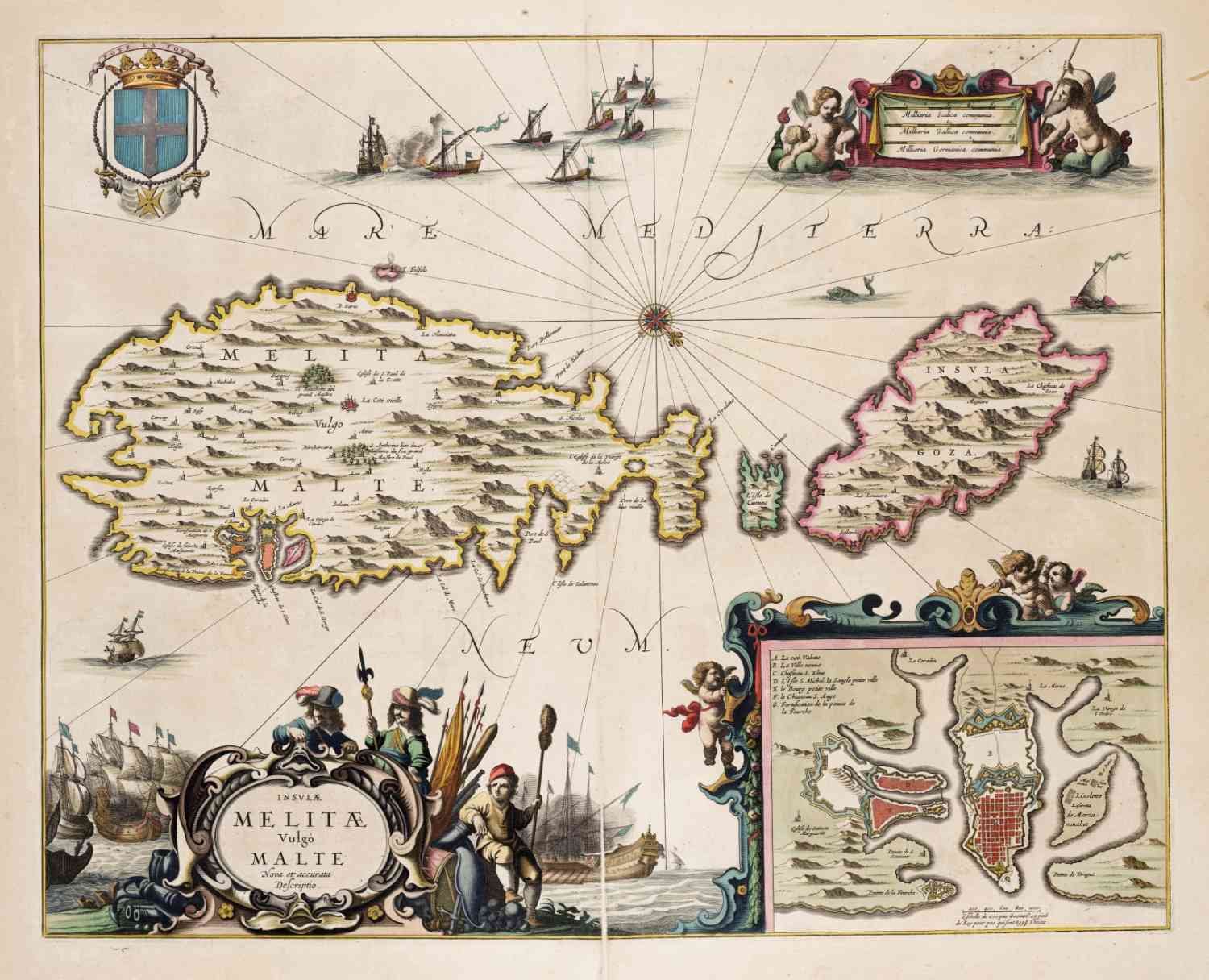 Kaart van Malta en Goza in de Middellandse Zee, in 1657 uitgegeven door Janssonius.