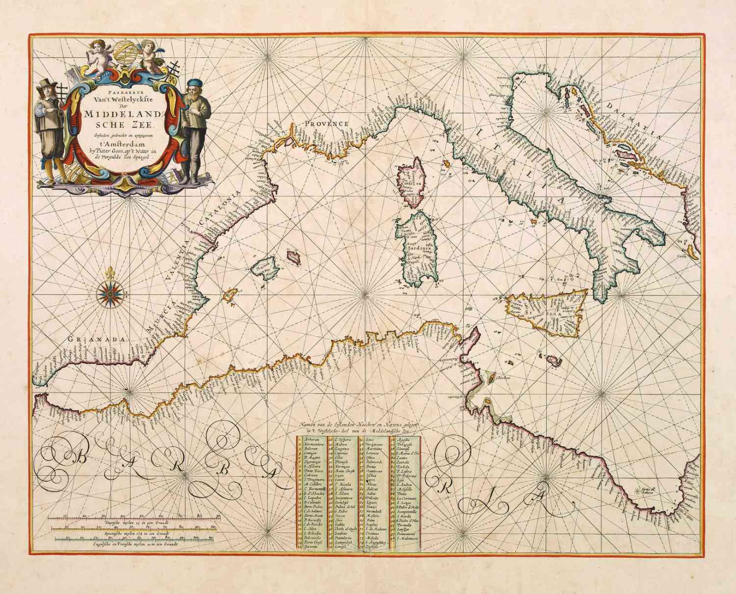 Kaart van het westelijk deel van de Middellandse zee, van Gibraltar tot en met Italië. In 1666 uitgegeven door Pieter Goos.
