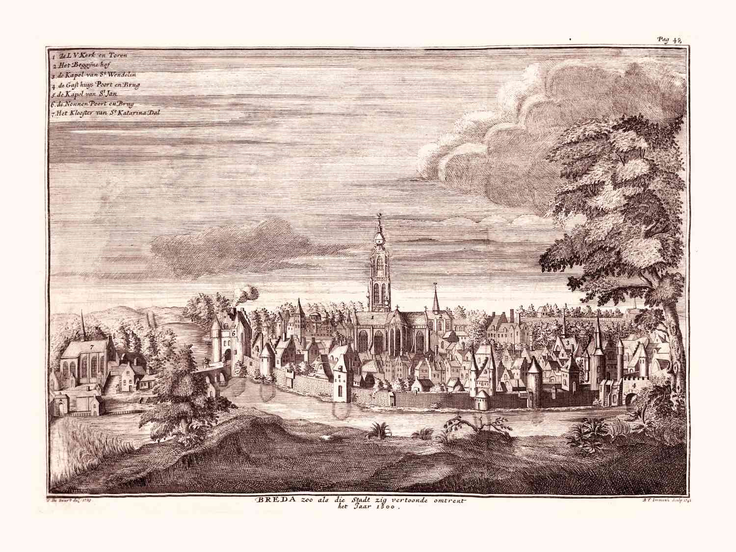Ongekleurd stadsgezicht op Breda, 1743 Immink.