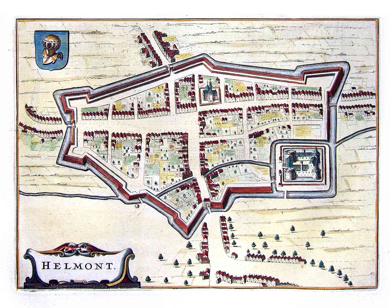 Ingekleurde stadsplattegrond van Helmond in 1649 gepubliceerd door Joan Blaeu,