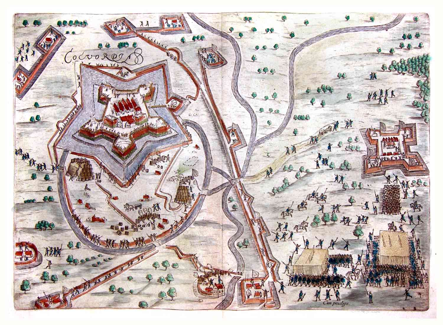 Gekleurde kaart van de vesting Coevorden in 1615, door Orlers.