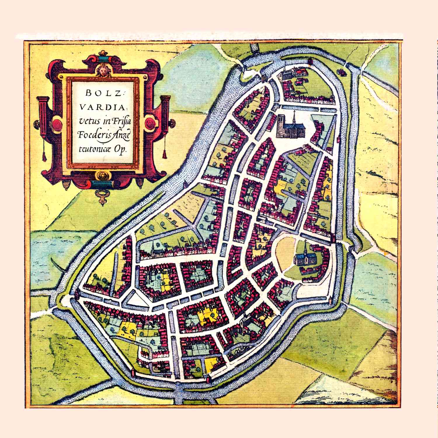 Vroege stadsplattegrond van Bolsward, in 1594 uitgegeven door Braun en Hogenberg.