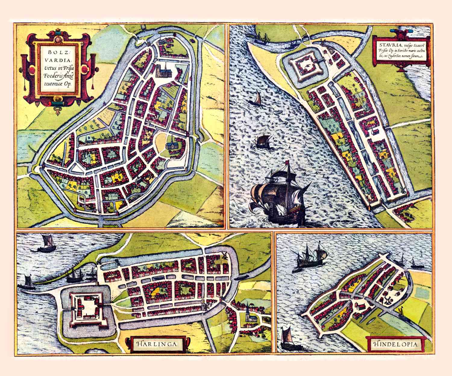 Kaart met vier vroege stadsplattegronden van de Friese steden Bolsward, Stavoren, Harlingen en Hindelopen, in 1`594 uitgegeven door Braun en Hogenberg.