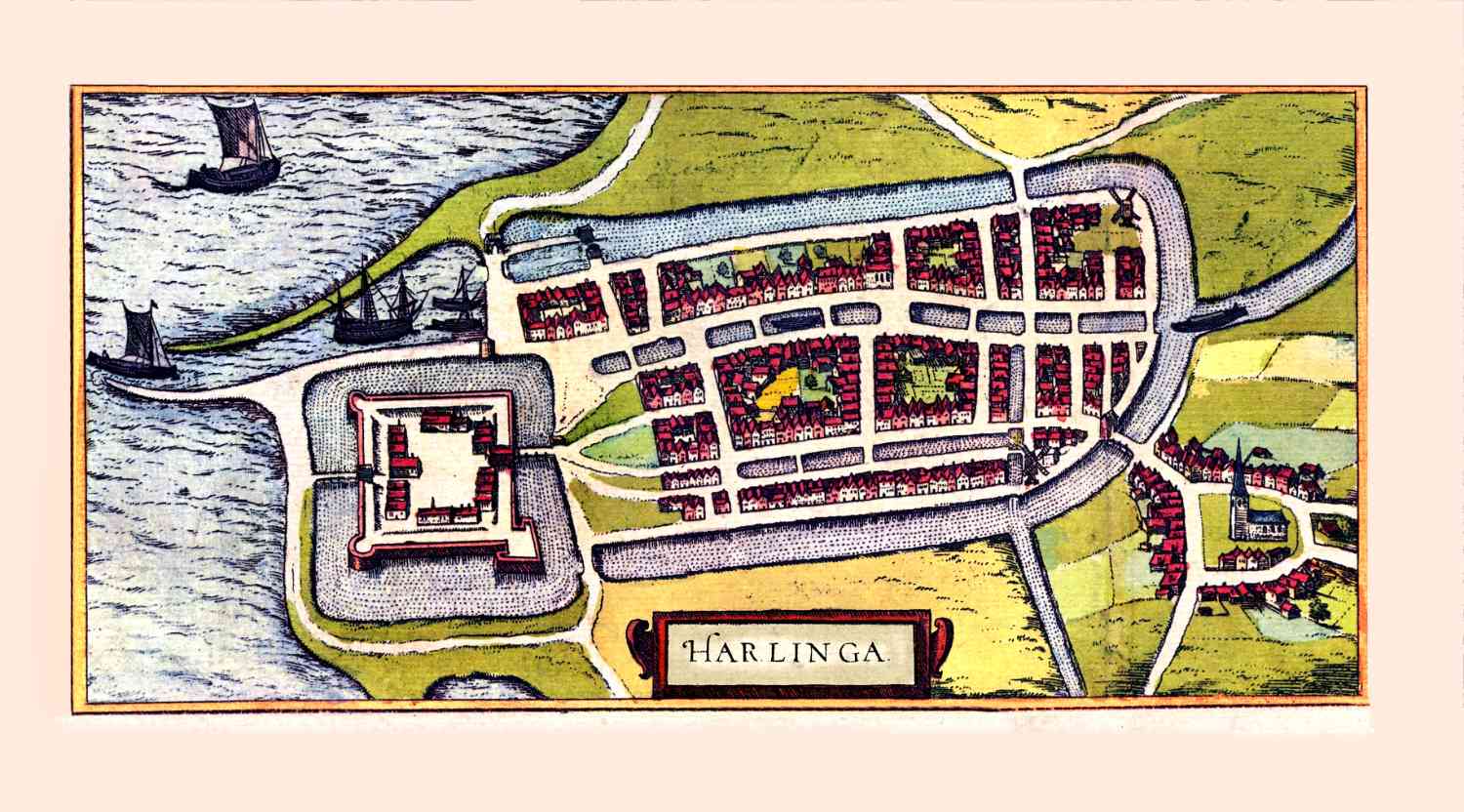 Vroege stadsplattegrond van Harlingen in 1594 uitgegeven door Braun en Hogenberg.