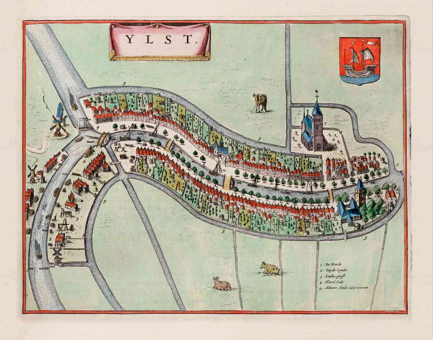 Fraai ingekleurde stadsplattegrond van IJlst, in 1649 uitgegeven door Joan Blaeu.