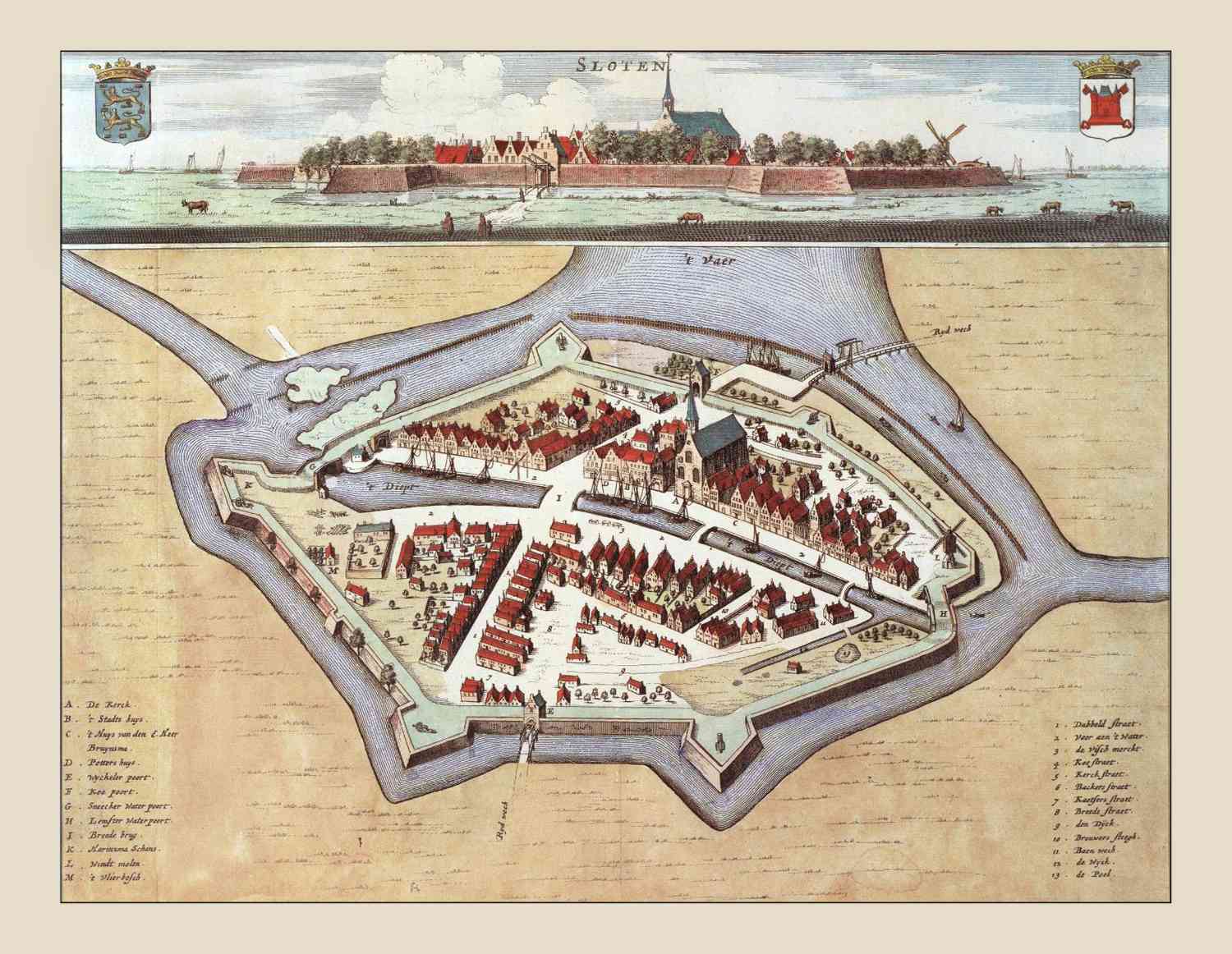 Kaart van Sloten in vogelvlucht en aangezicht uit de z.g. Schotanus Atlas.