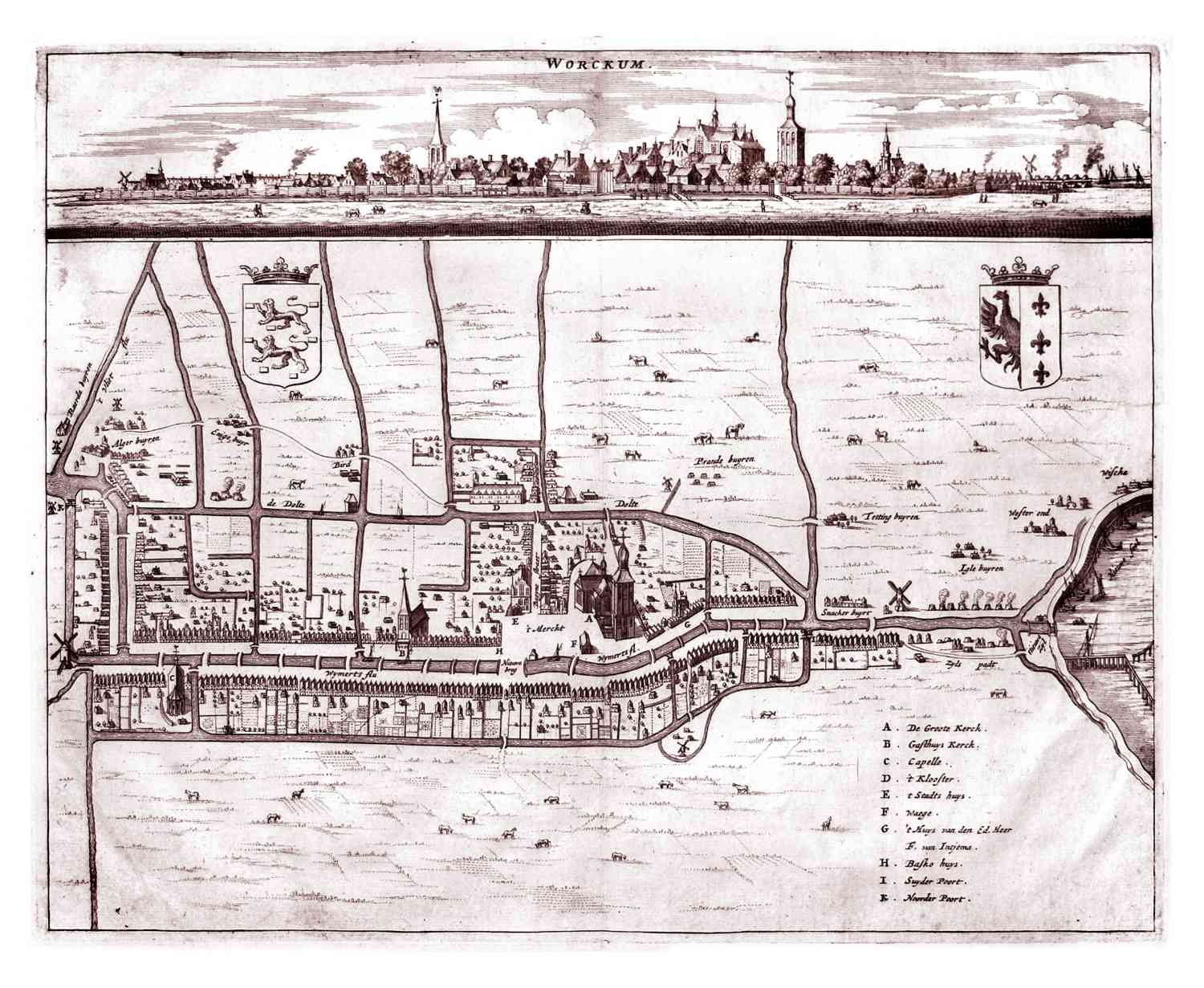 Plattegrond en gezicht op Workum in 1664 uitgegeven door Haackma en Gravius.