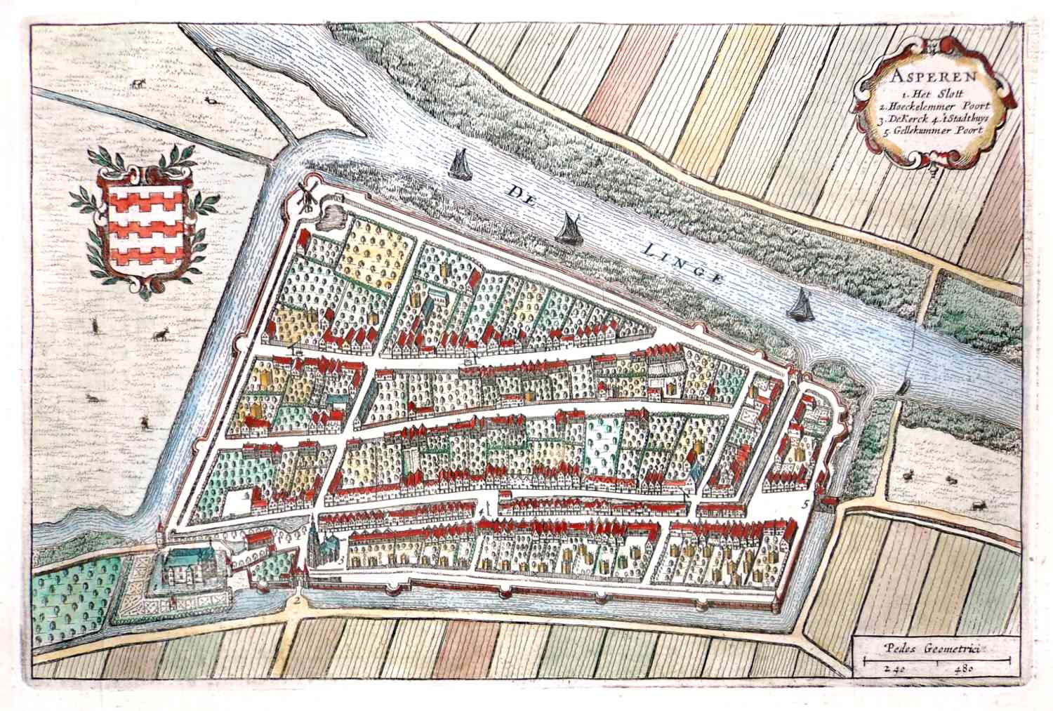 Deze verfijnde oude kaart Asperen 1649 Blaeu biedt een prachtig vogelvluchtperspectief op de stad aan de Linge tijdens het midden van de zeventiende eeuw. Asperen was in die tijd een essentiële schakel in de verdediging van het graafschap Leerdam en de provincie Holland. U ziet de robuuste stadsmuren, de monumentale Sint-Catharinakerk en de kenmerkende grachtenstructuur met een onwaarschijnlijke precisie afgebeeld. De details op deze kopergravure zijn werkelijk fascinerend voor elke geschiedenisliefhebber. Vooral de strategische ligging tussen de rivier en de omliggende landerijen op deze oude kaart Asperen 1649 Blaeu valt direct op.