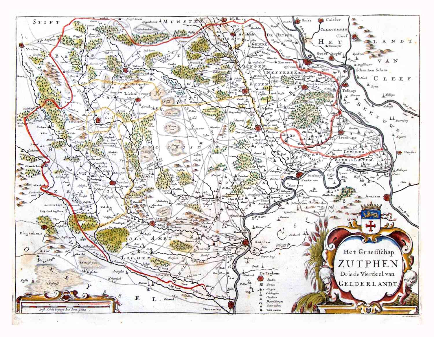 Kaart van een deel van Gelderland, Graafschap Zutphen. Het noorden is links op de kaart.