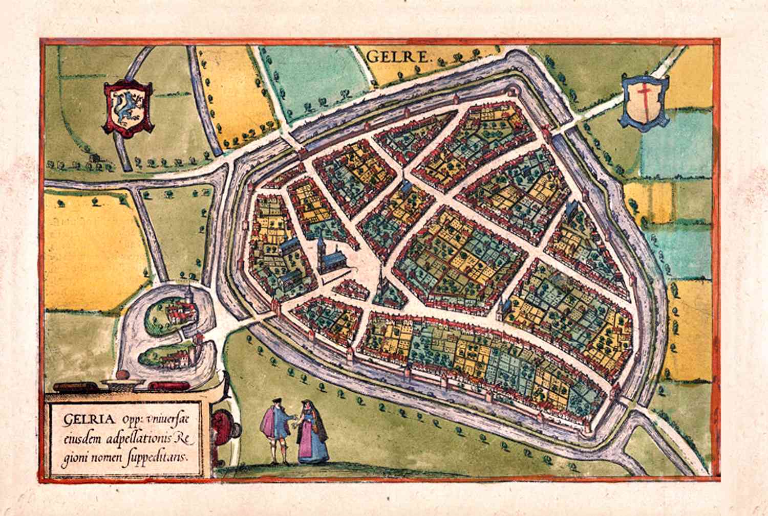 Stadsplattegrondje van Geldern (thans Duits gebied) in 1590 uitgegeven door Braun en Hogenberg.