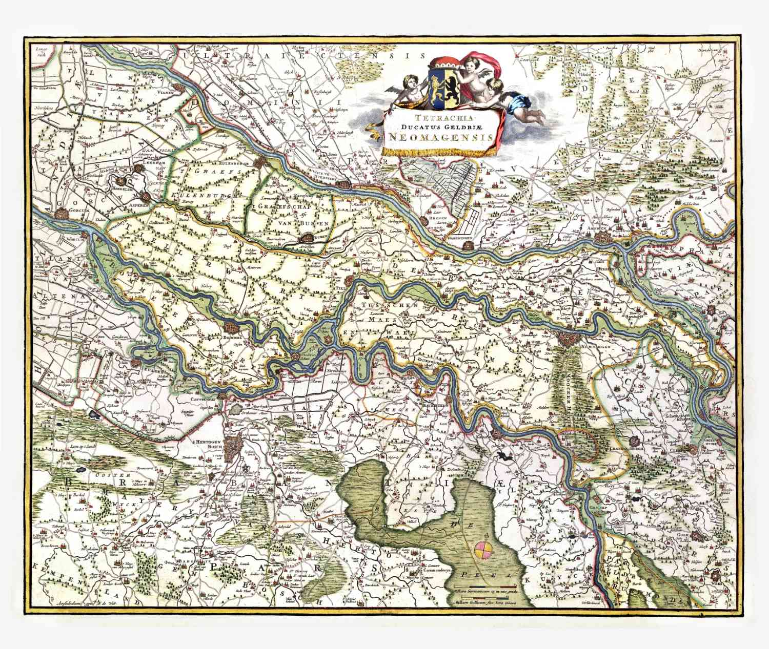 Kaart van het Rivierengebied en de Betuwe van Gorkum tot Nijmegen en Arnhem, in 1680 uitgegeven door Frederik de Wit.