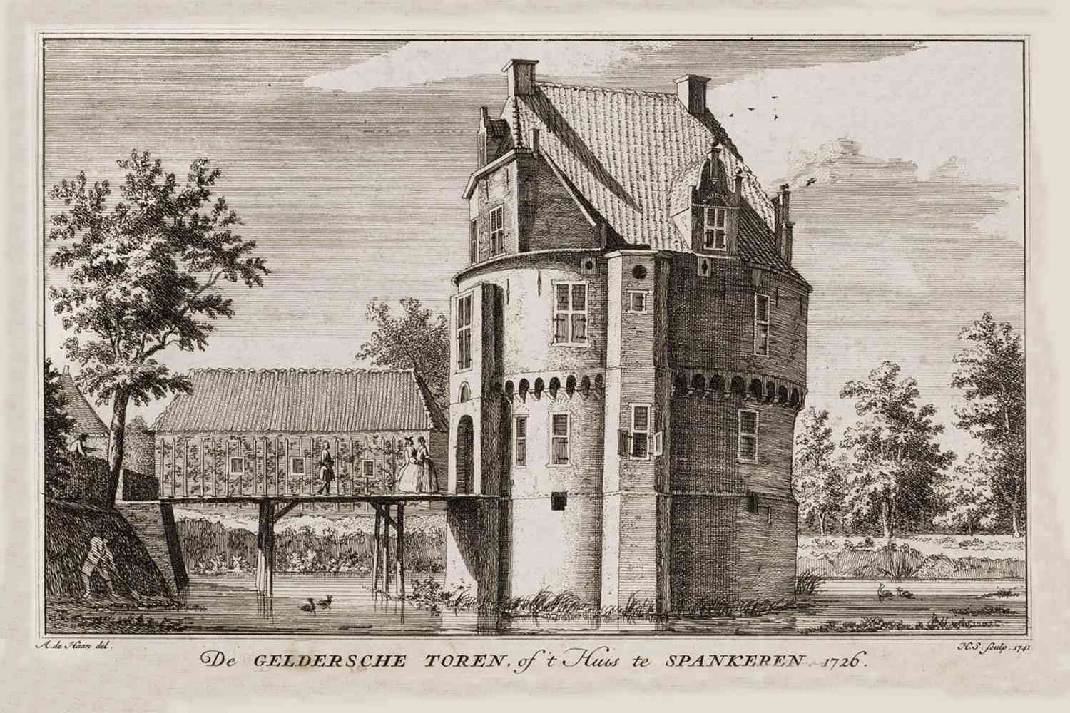 Het huis te Spankeren, ook genaamd de Geldersche Toren, in 1726 getekend door A. De Haen.