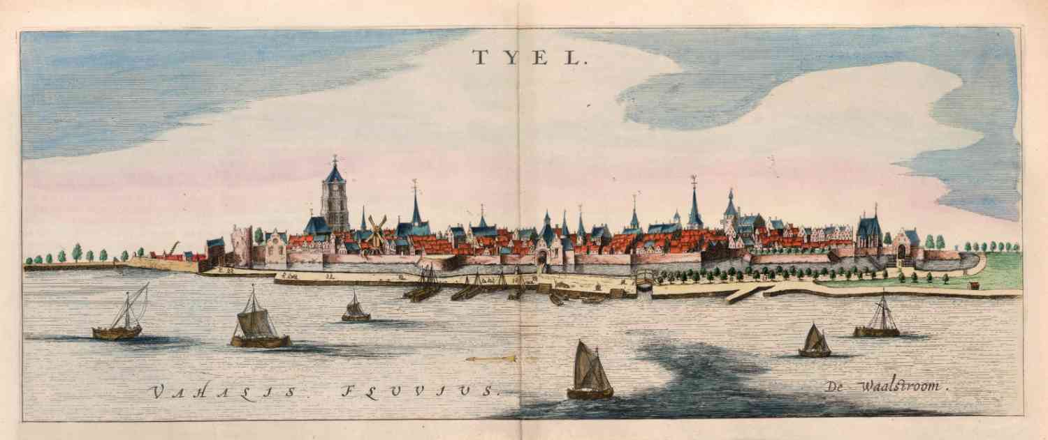 Gezicht op Tiel vanaf de Waal, in 1649 uitgegeven door Joan Blaeu.