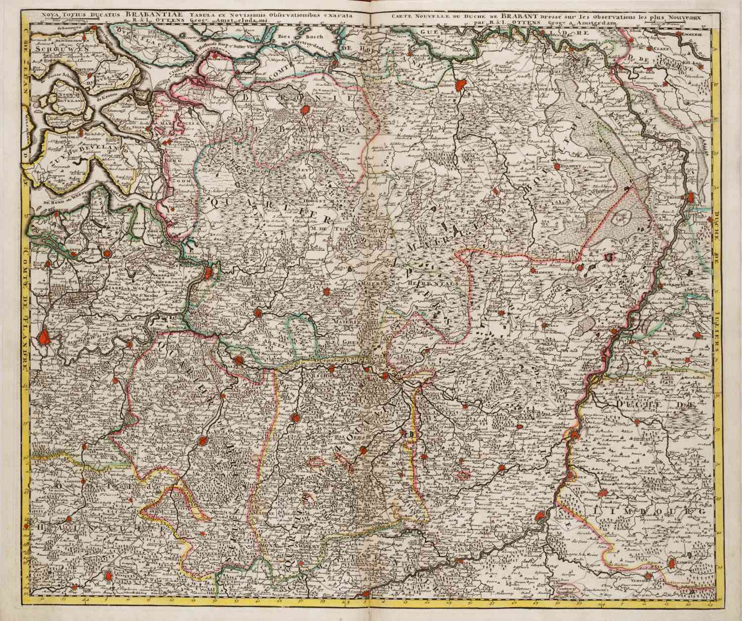 Kaart van Nederlands en Belgisch Brabant en een groot deel van Limburg met rechts in beeld de loop van de Maas. In 1740 uitgegeven door Ottens.
