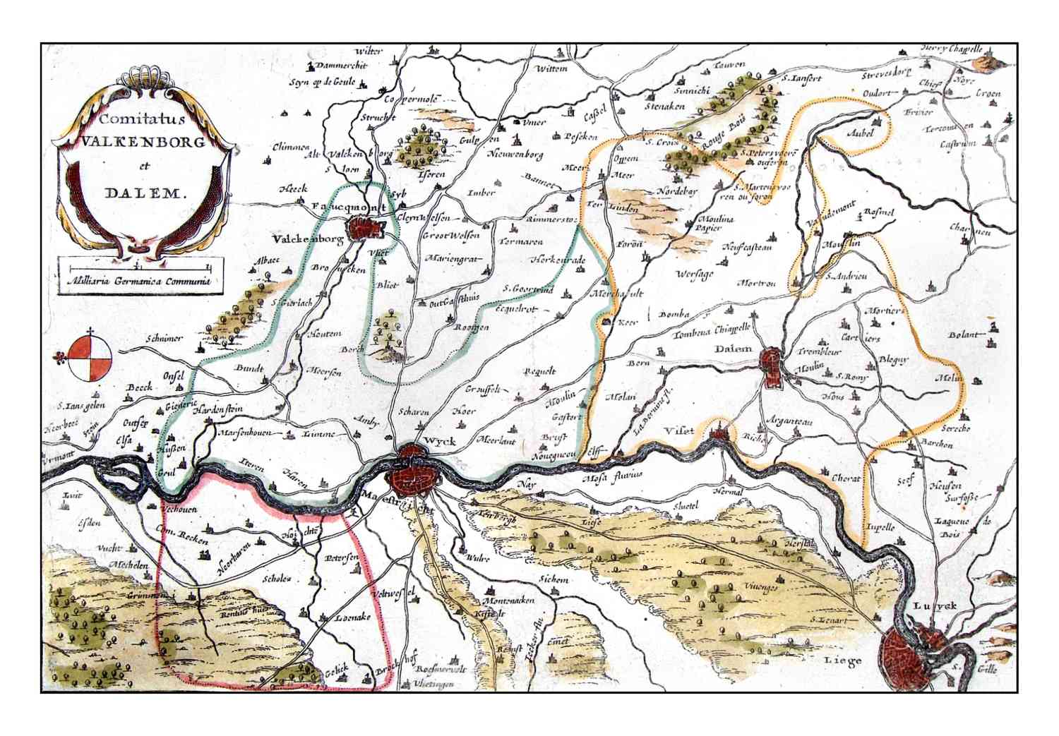 Kaart van Zuid Limburg omgeving Maastricht-Valkenburg-Dalem-Luik. Het noorden is links op de kaart.