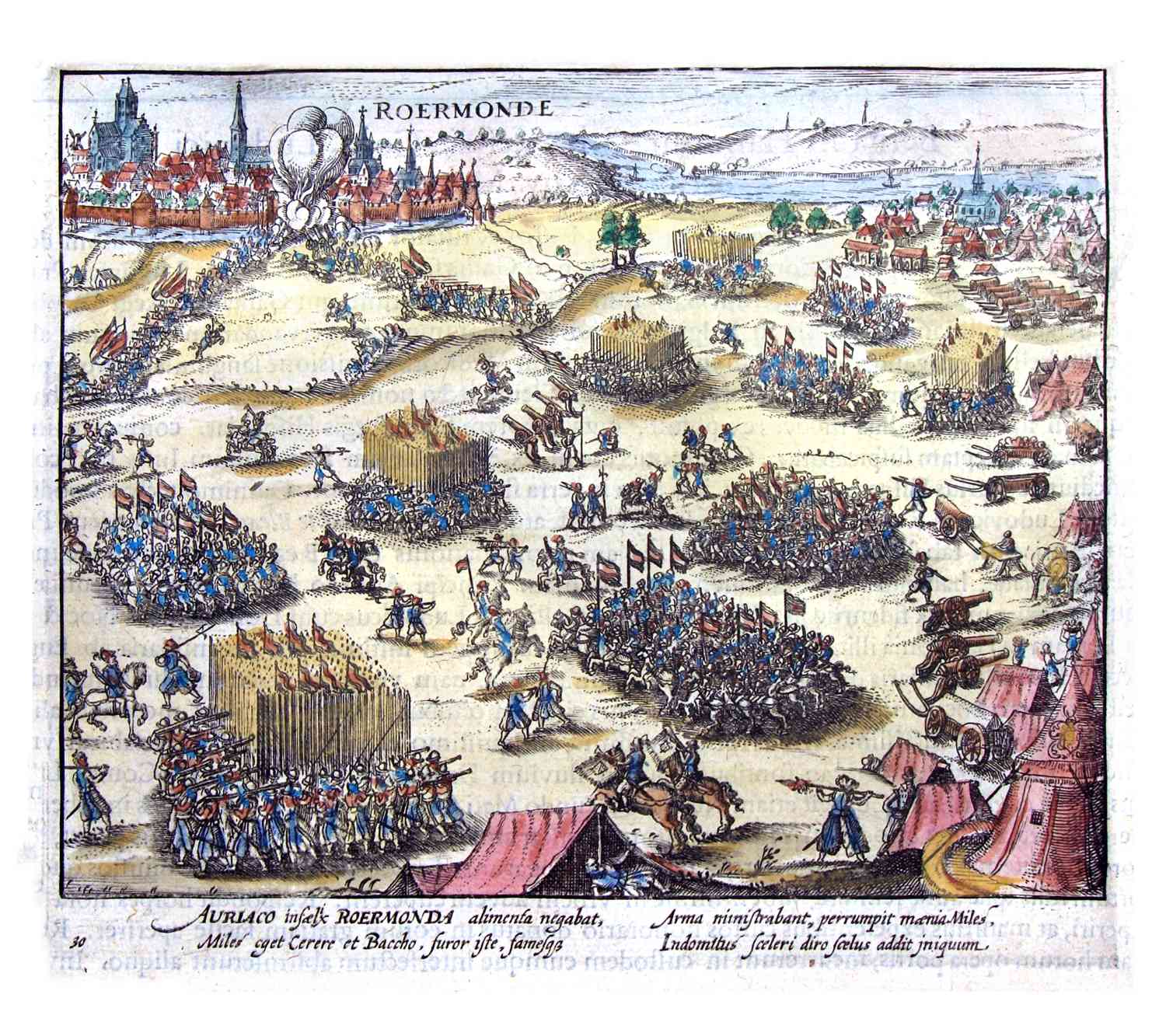 Fraaie ingekleurde afbeelding van de belegering van Roermond in 1622 gepubliceerd door Baudartius.