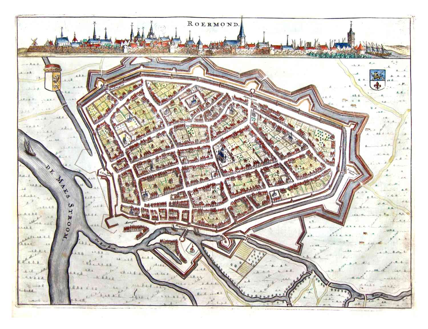 Ingekleurde stadsplattegrond en aangezicht van Roermond in 1654 gepubliceerd door Geelkercken.