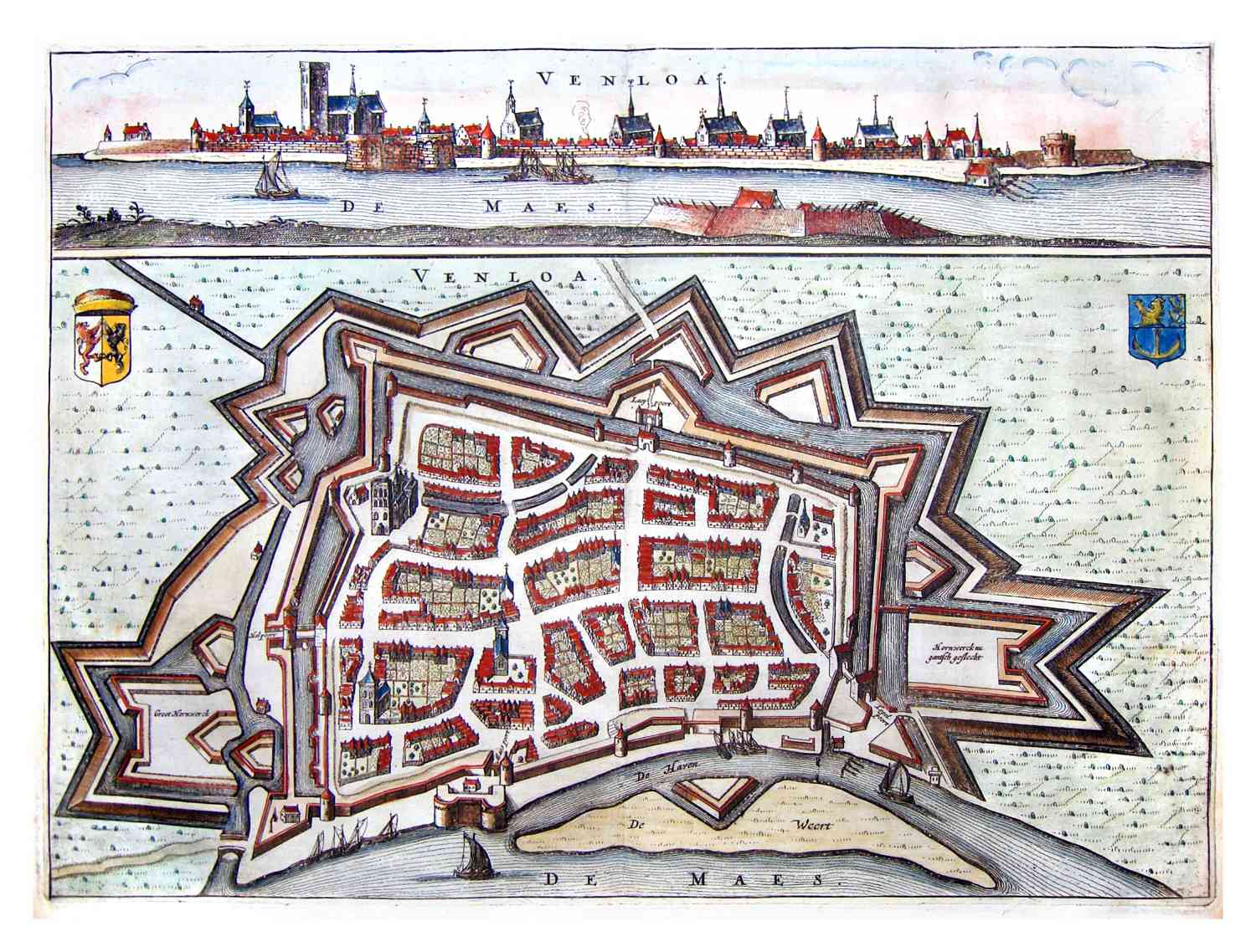 Prachtig ingekleurde plattegrond en gezicht op Venlo, in 1654 gepubliceerd door Geelkercken.