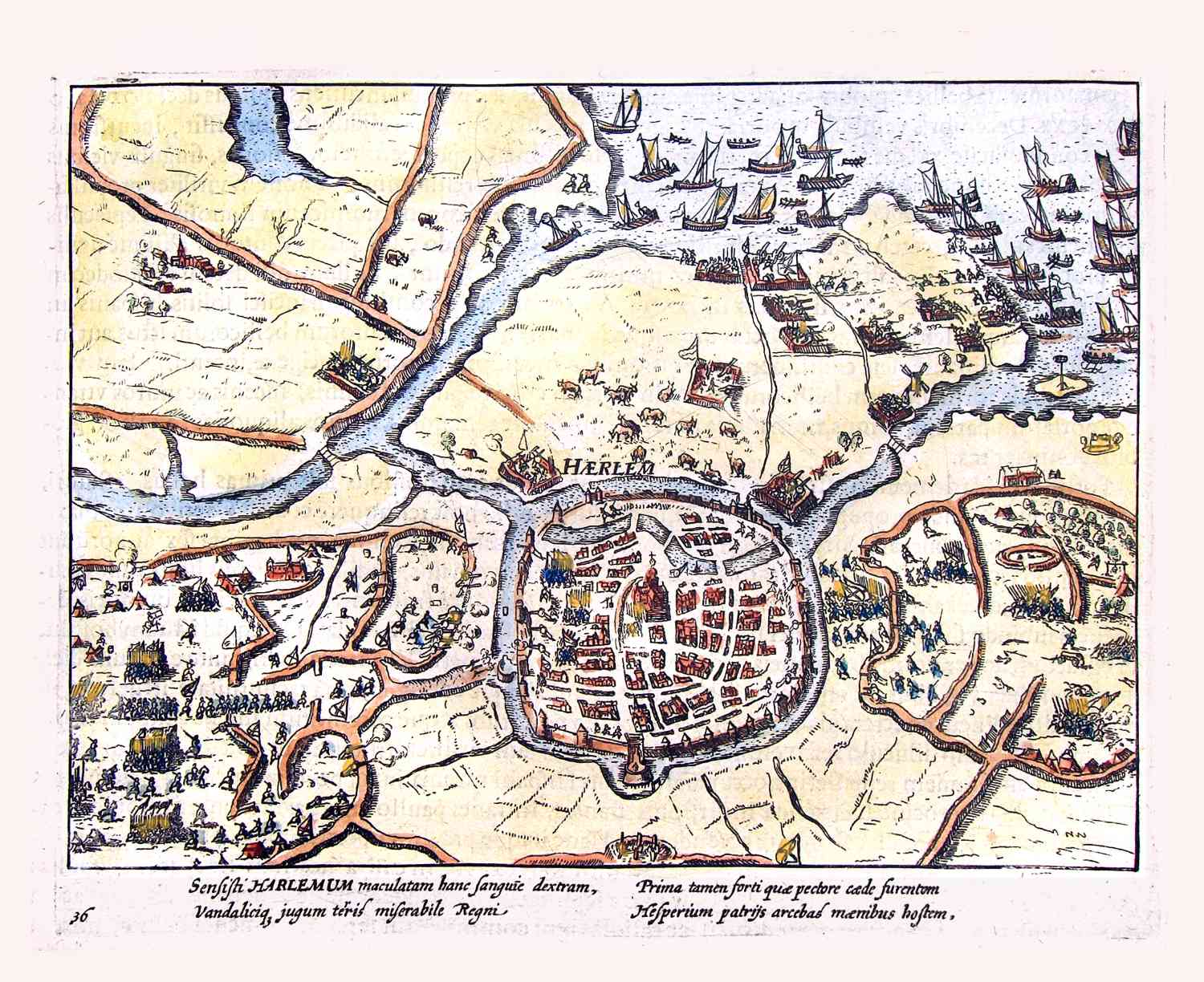 Ingekleurde afbeelding van de belegering van Haarlem in 1622 gepubliceerd door Baudartius.
