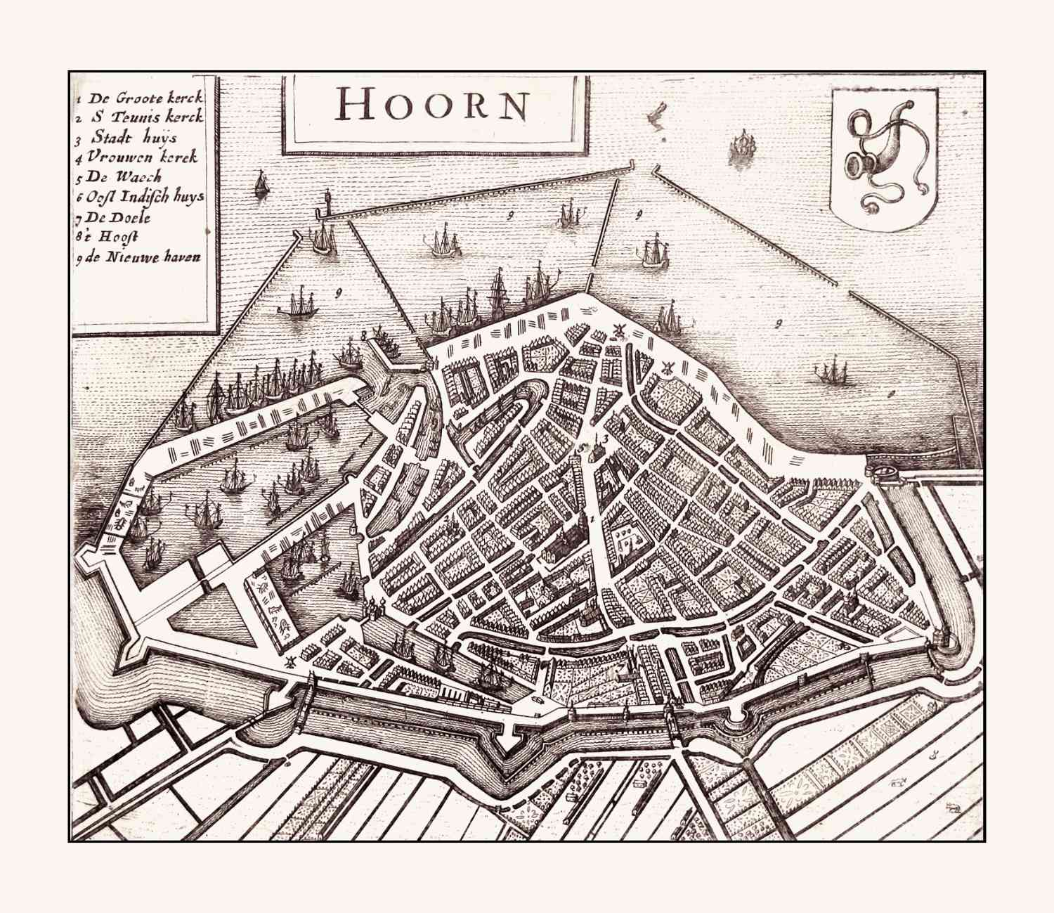 Klein ongekleurd kaartje van Hoorn, in 1633 uitgegeven door Guiccardini.