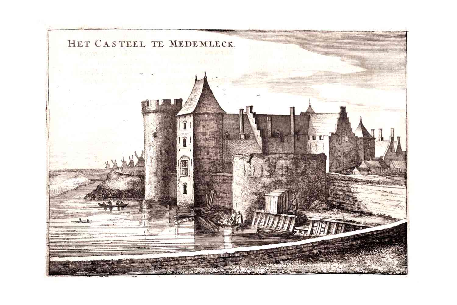 Beeld van het kasteel Medemblik aan de Zuiderzee, gepubliceerd in 1649 door Joan Blaeu.