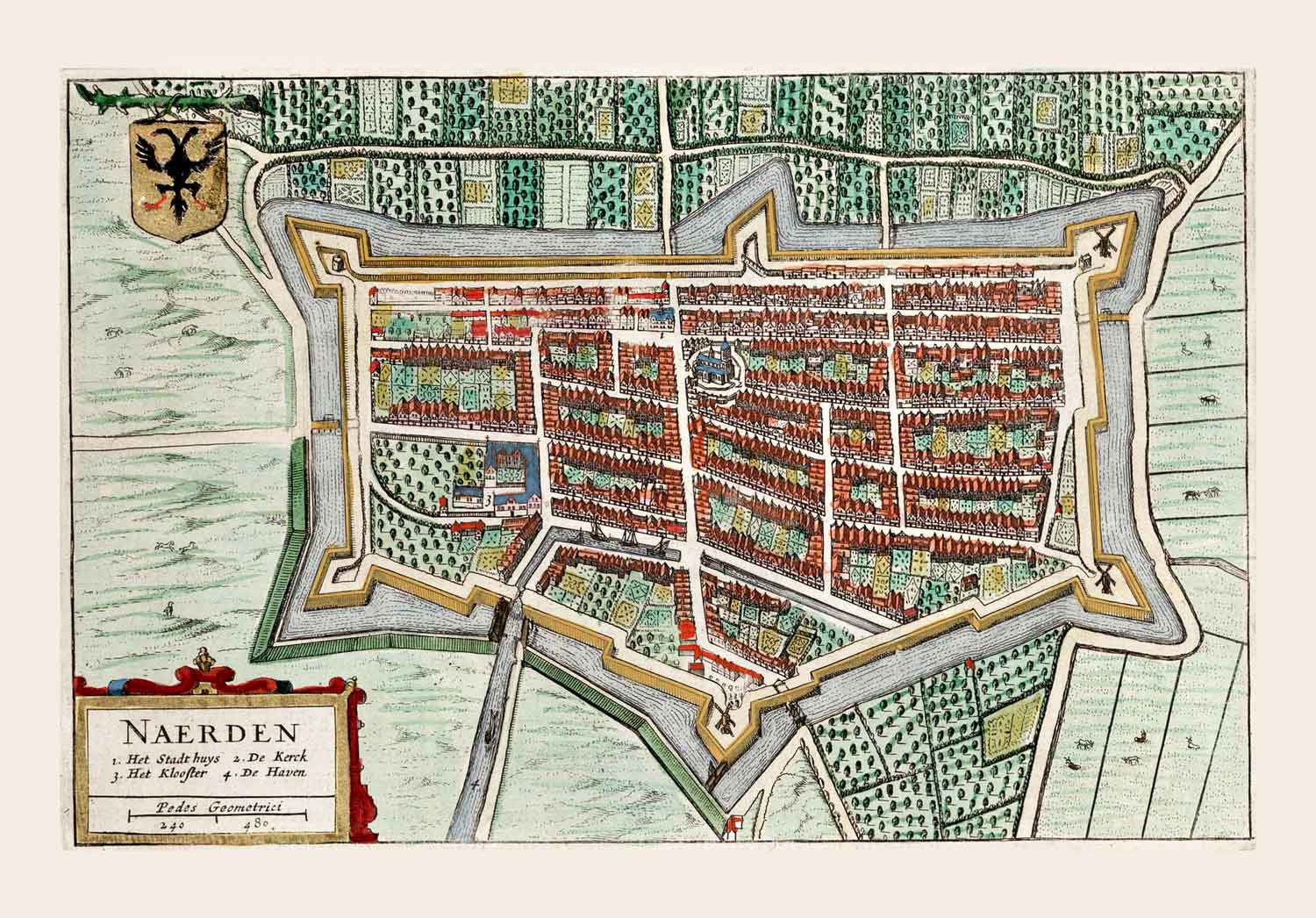 De artistieke kwaliteit van deze kopergravure is verder ongeëvenaard in de zeventiende eeuw. De verfijnde lijnen laten de individuele huizen en de structuur van de straten haarscherp zien. Het werk biedt zodoende een accuraat overzicht van de militaire architectuur uit die tijd. De compositie is evenwichtig en wordt bovendien gesierd door het stadswapen van Naarden. Wij drukken dit historische werk vervolgens met de Giclée-techniek op origineel Hahnemühle papier. Hierdoor blijven de diepe contrasten zeker 80 jaar behouden. De beeldmaat van dit werk is tenslotte 25,5 x 20,5 cm.